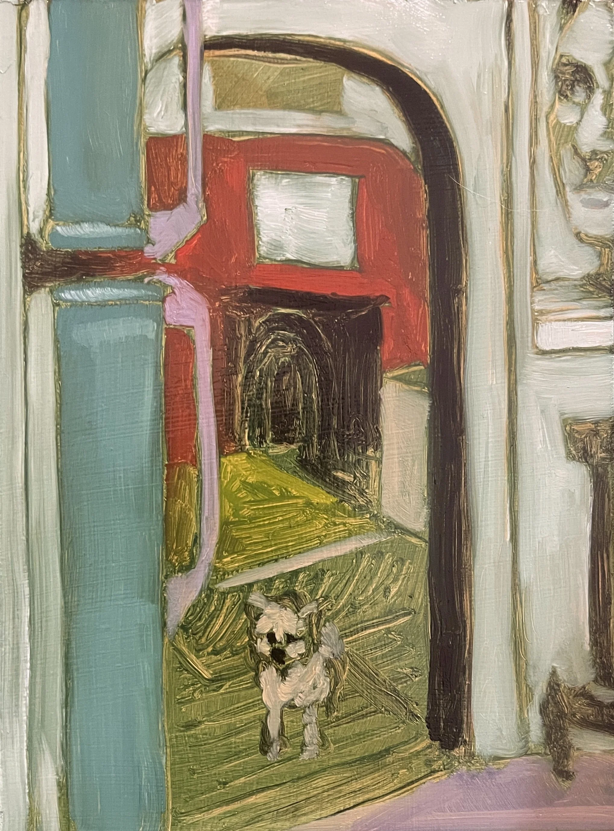 This painting belongs to my project, GRID: 100 Mini Paintings, an exploration of composition. The hundred paintings are meant to act as a body of work, created over a ten-month timeline to mimic digital albums with a chronological hierarchy such as Instagram, Google or Apple Photos. This work references Van Gogh's The Night Cafe (1888), which was reinterpreted by Gauguin in his work, At the Cafe (1888). The image depicts my dog, Golda, who won't cross the threshold into my kitchen where I make my paintings. The title references her loneliness and mine and our mutual longing for companionship; hers to play with me and mine to be in conversation with artist peers through our work.