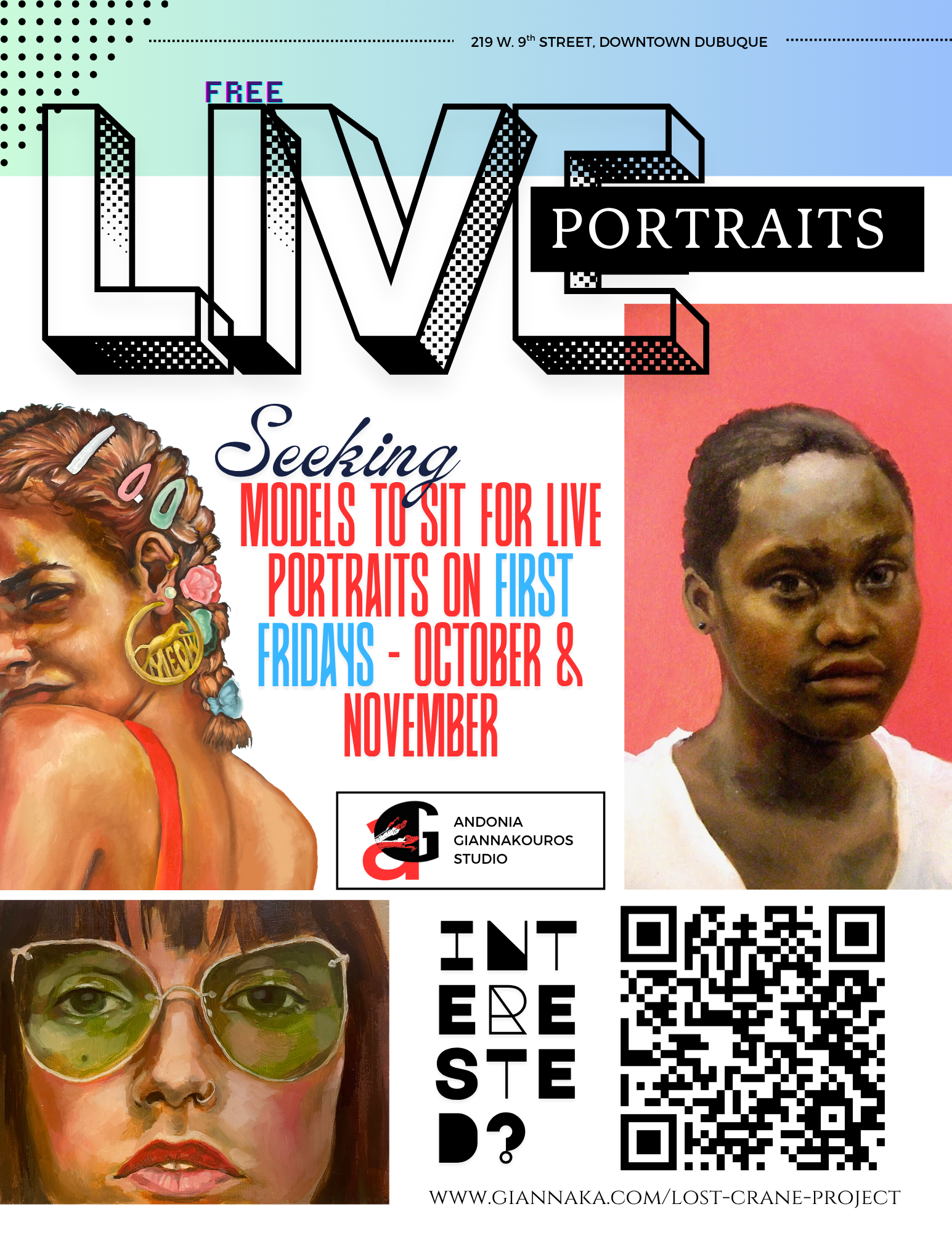 I am seeking models to come to my studio (219 W. 9th Street, Downtown Dubuque) during First Friday programming in October (10/3/25) or November (11/7/25) for live sitting sessions while I am open to the public.
